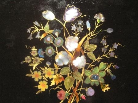 Velador de madera esmaltada con pinturas florales e incrustaciones de nácar.