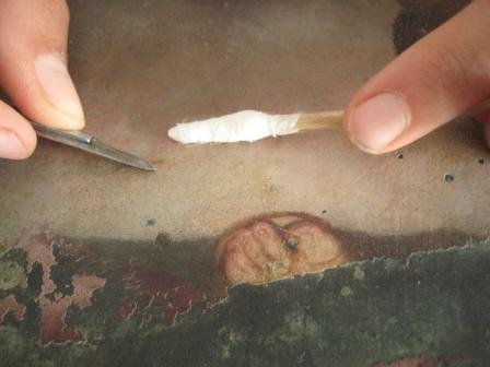 Esta obra, realizada sobre un soporte de cobre, había perdido su planitud y presentaba oxidaciones en forma de sales de color verde, que habían migrado a través de las capas superiores, manchando el color y provocando reacciones químicas con algunos pigmentos. Se realizó una limpieza de las sales metálicas y una reintegración volumétrica y cromática de los estratos perdidos.