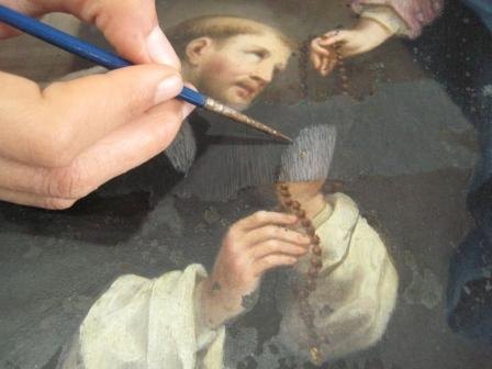 Esta obra, realizada sobre un soporte de cobre, había perdido su planitud y presentaba oxidaciones en forma de sales de color verde, que habían migrado a través de las capas superiores, manchando el color y provocando reacciones químicas con algunos pigmentos. Se realizó una limpieza de las sales metálicas y una reintegración volumétrica y cromática de los estratos perdidos.