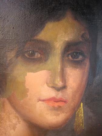 Lo asombroso de esta restauración fue la sorpresa de la verdadera pintura de Julio Romero debajo de lo que parecía una burda copia. Según se iban eliminando los repintes, la mujer iba perdiendo una piel tosca y verdina para recuperar la tersura y tonalidad propia de una joven andaluza. Incluso los pendientes eran falsos…