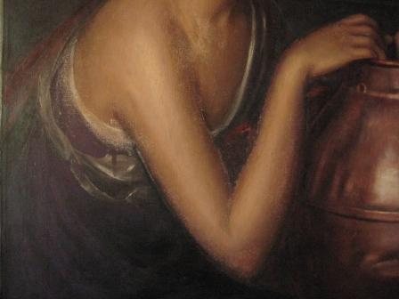 Lo asombroso de esta restauración fue la sorpresa de la verdadera pintura de Julio Romero debajo de lo que parecía una burda copia. Según se iban eliminando los repintes, la mujer iba perdiendo una piel tosca y verdina para recuperar la tersura y tonalidad propia de una joven andaluza. Incluso los pendientes eran falsos…