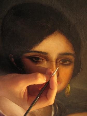Lo asombroso de esta restauración fue la sorpresa de la verdadera pintura de Julio Romero debajo de lo que parecía una burda copia. Según se iban eliminando los repintes, la mujer iba perdiendo una piel tosca y verdina para recuperar la tersura y tonalidad propia de una joven andaluza. Incluso los pendientes eran falsos…