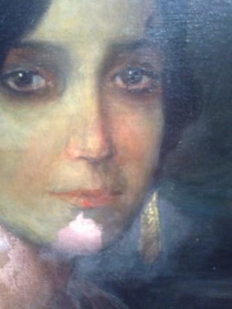 Lo asombroso de esta restauración fue la sorpresa de la verdadera pintura de Julio Romero debajo de lo que parecía una burda copia. Según se iban eliminando los repintes, la mujer iba perdiendo una piel tosca y verdina para recuperar la tersura y tonalidad propia de una joven andaluza. Incluso los pendientes eran falsos…